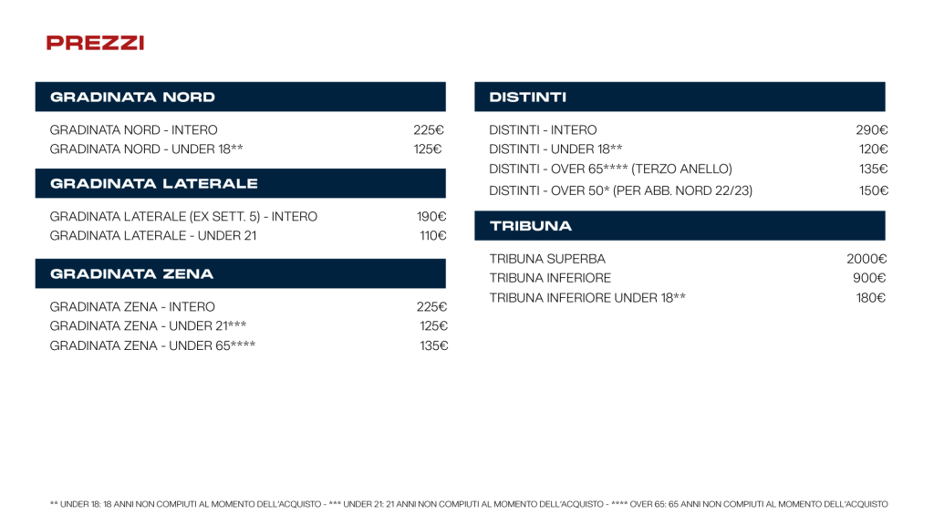 Promo Over 50 – Gli abbonati Over 50 di Gradinata Nord che non intendono confermare l’abbonamento in questo settore possono, al prezzo speciale di €150*, scegliere un posto disponibile nel settore Distinti entro la fine delle prelazioni.