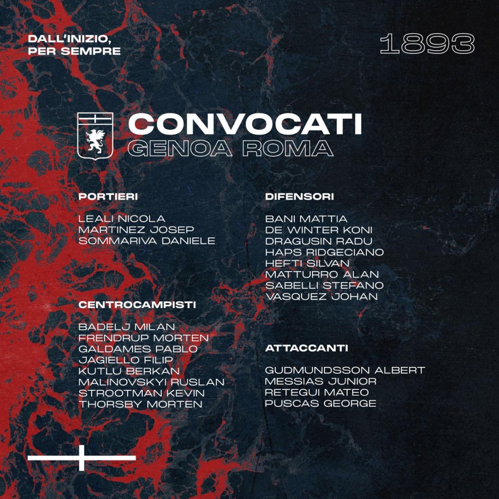 NewsLa rosa dei giocatori e portieri selezionati dallo staff tecnico per la partita Genoa-Roma. La squadra ha raggiunto il ritiro pre-partita al termine della rifinitura eseguita in mattinata.