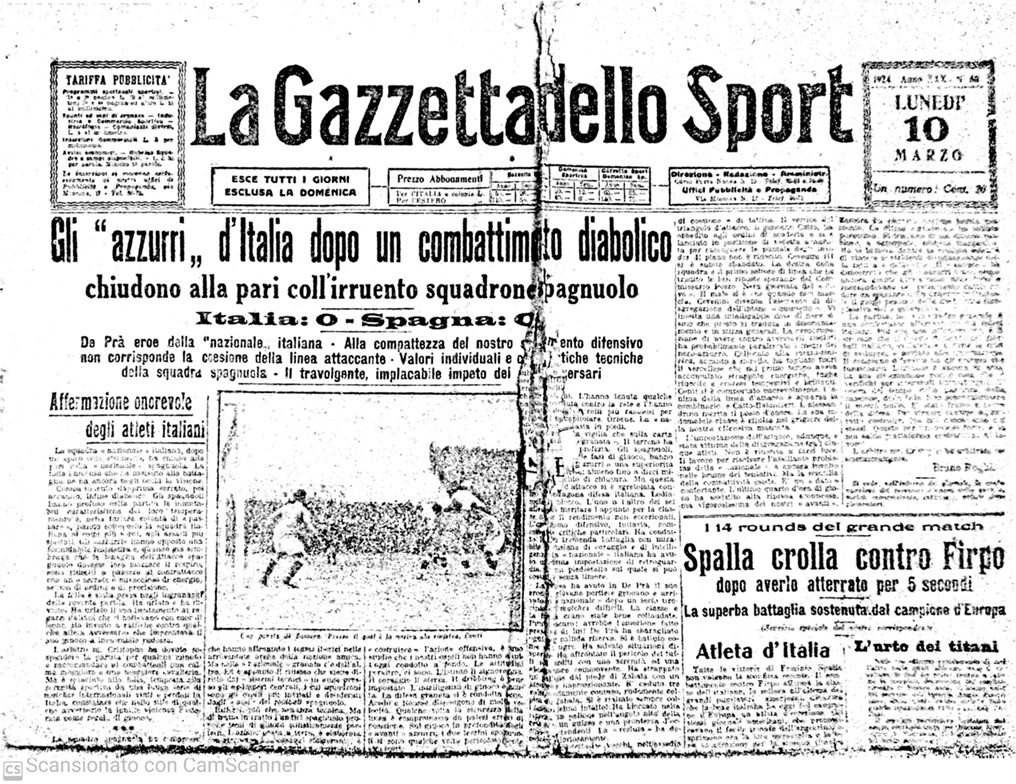 Toccare il cielo con un dito – Guardare al futuro, coltivando il passato e il fiore del ricordo. Volare nella storia schivando i radar della retorica e vestendo le mani nel destino. Le cronache spifferano che quel giorno, per l’esordio azzurro sul campo del Milan, Giovanni De Prà uscì dal terreno pressoché incosciente. Nemmeno i colpi, ai limiti del codice penale, inferti dagli avversari e, per metterci il carico, gli effetti delle violente contusioni assorbite lì per lì in qualche modo, lo fecero desistere dalla volontà di terminare l’incontro a guardia della porta. Nessuno lo bucò sebbene vedesse le stelle dal dolore. Italia-Spagna si concluse sullo 0-0 con una serie di suoi interventi prodigiosi.
