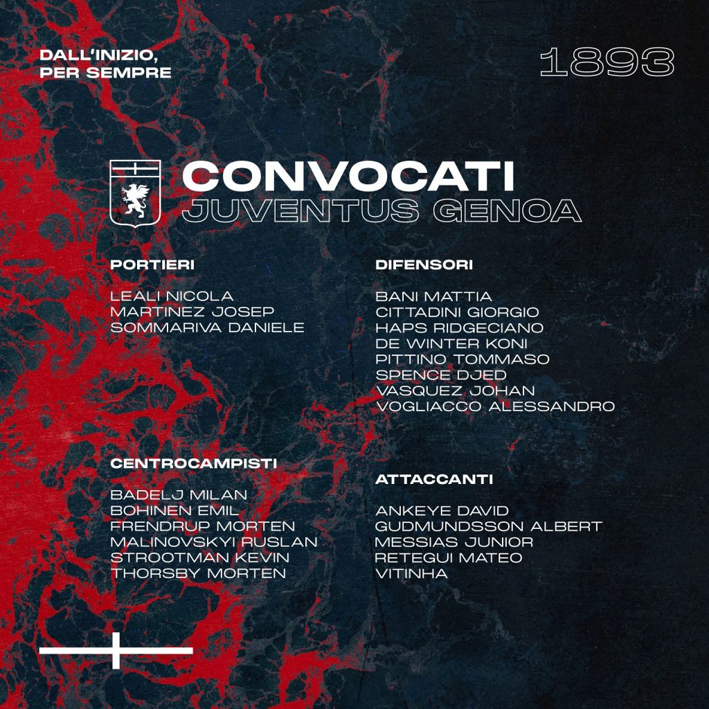 NewsDopo la rifinitura e l’incontro con i supporter al centro sportivo, lo staff tecnico ha reso noti i convocati per il lunch-match allo Stadium. In tribuna saranno presenti tutti gli stati maggiori del Genoa.