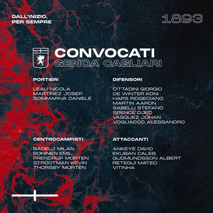Ufficializzati al termine della seduta di rifinitura i giocatori a disposizione per la partita con il Cagliari. Torna in lista Vitinha. Tra gli assenti Bani, Malinovskyi, Matturro e Messias. Calcio d’inizio al Ferraris stasera alle 20:45. E’ consigliato recarsi con largo anticipo allo stadio per non rimanere imbottigliati nel traffico e agevolare le operazioni di controllo ai varchi di ingresso.