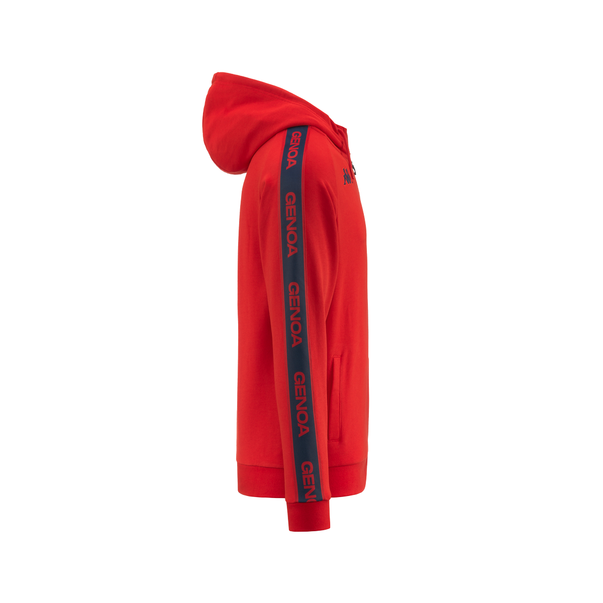 Cappuccio, manica lunga, full zip, tasche laterali, polsini e fondo in costina. Tape Genoa applicato sulle maniche, Logo Omini e logo Team ricamati sul petto.