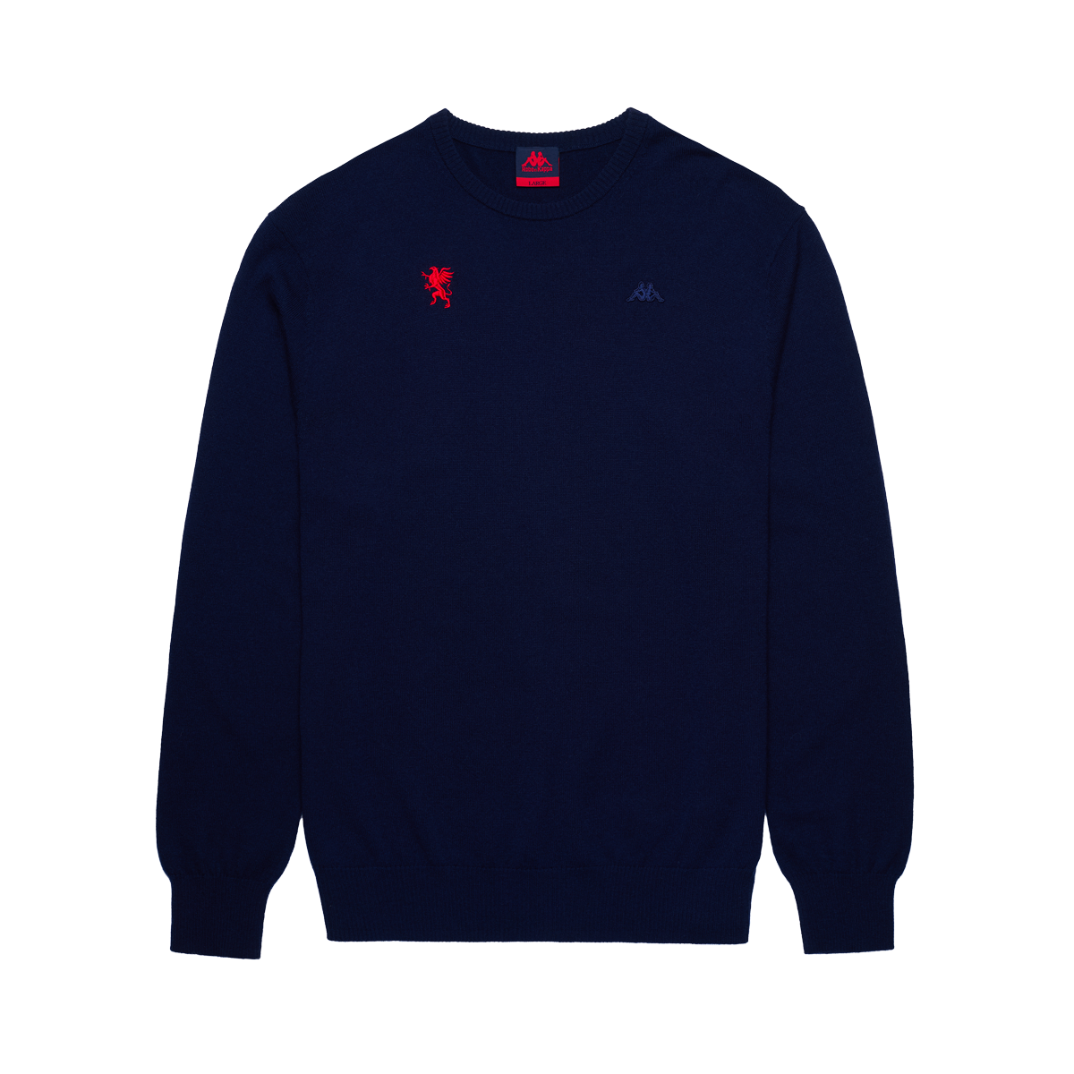 Pullover in lambswool misto poliammide. Bordi in costina, toppe in punto waffle sulle maniche. Logo Omini e personalizzazione Genoa applicati sul petto.