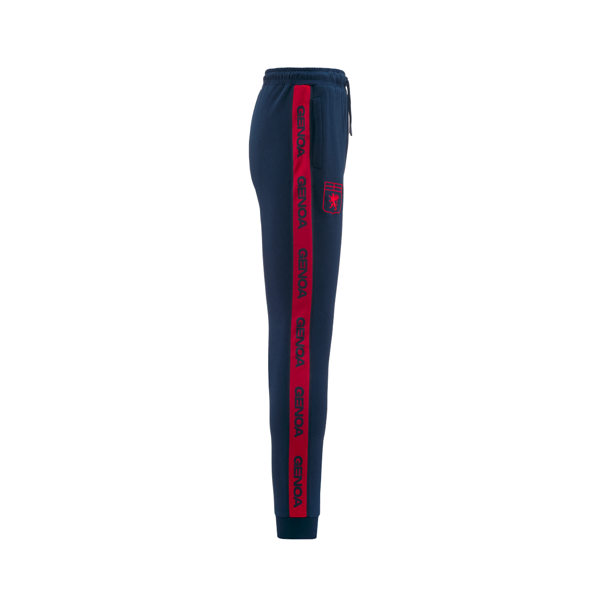 Tasche laterali, fondo in costina e vita con elastico interno. Tape Genoa applicato sui fianchi, logo Omini e Team logo ricamati sul fronte