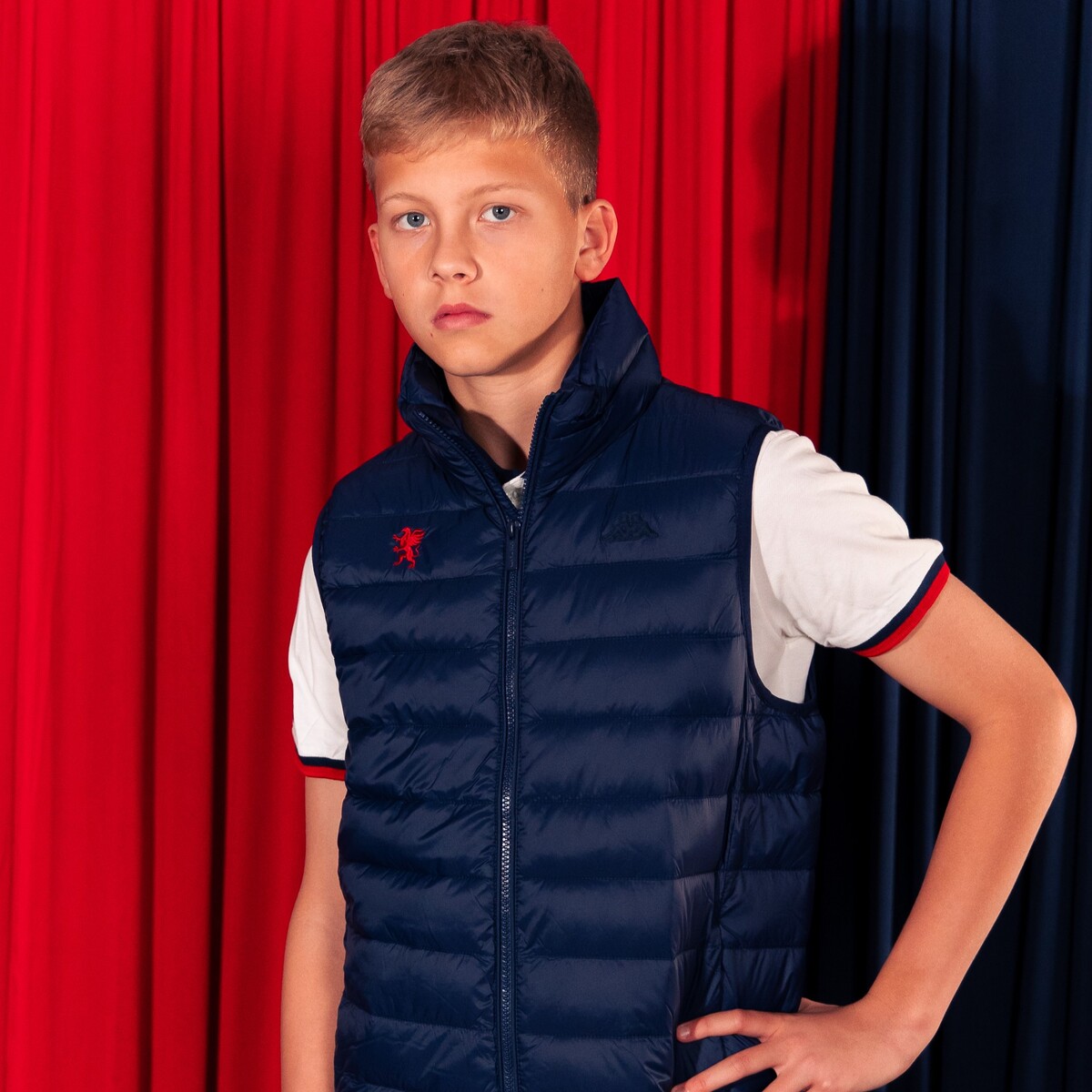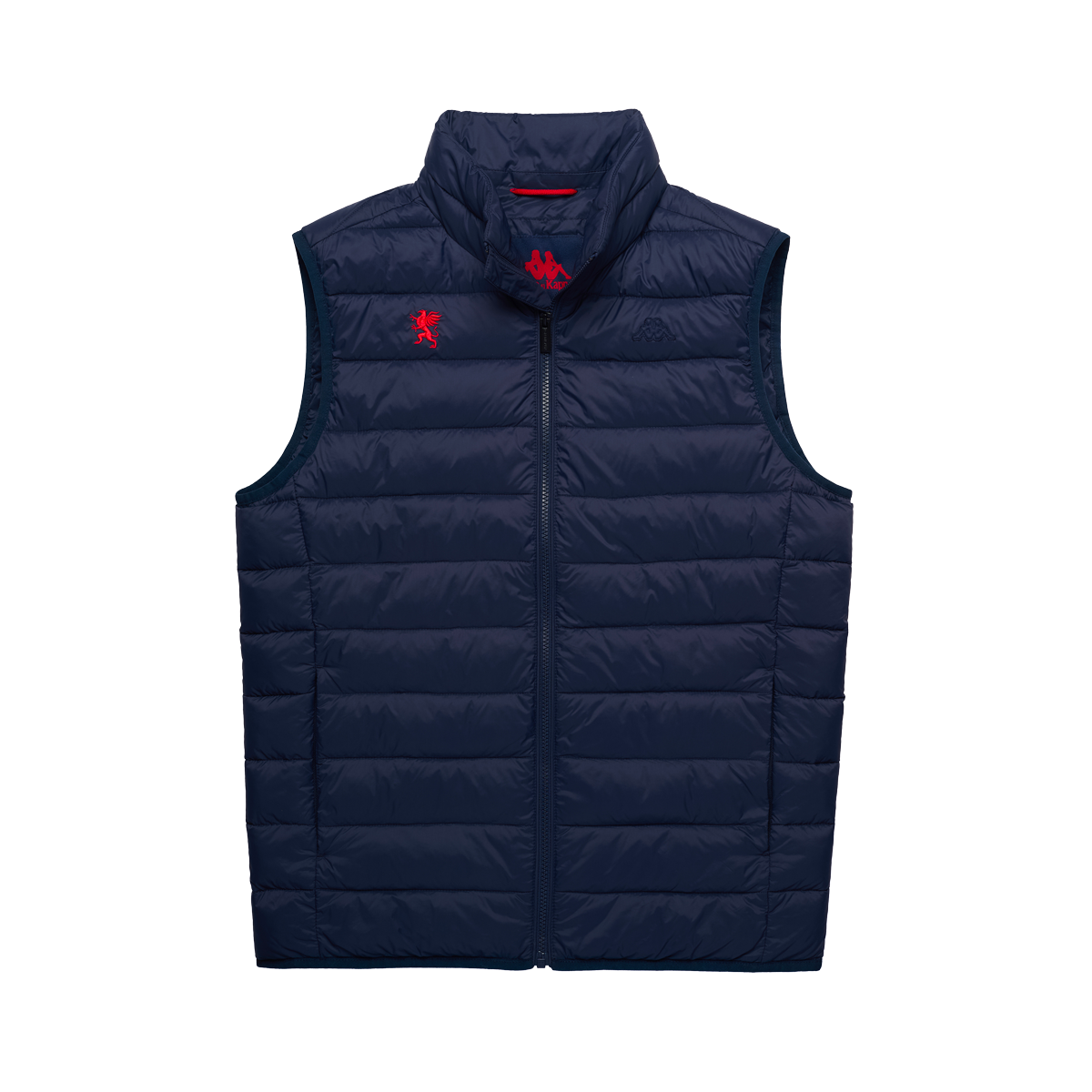 Tessuto in in nylon con imbottitura 100 gr. Chiusura frontale con zip. Logo omini in silicone applicato sul petto, personalizzazioni Genoa.